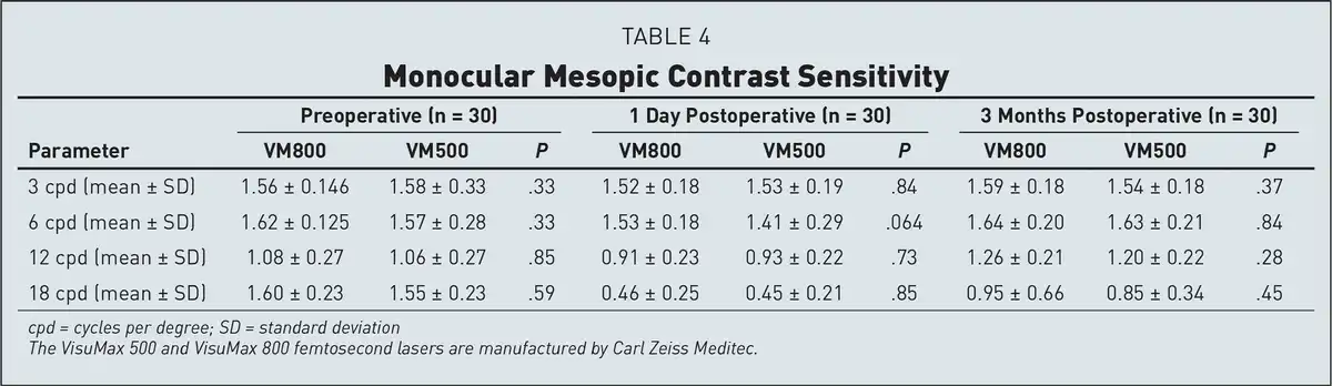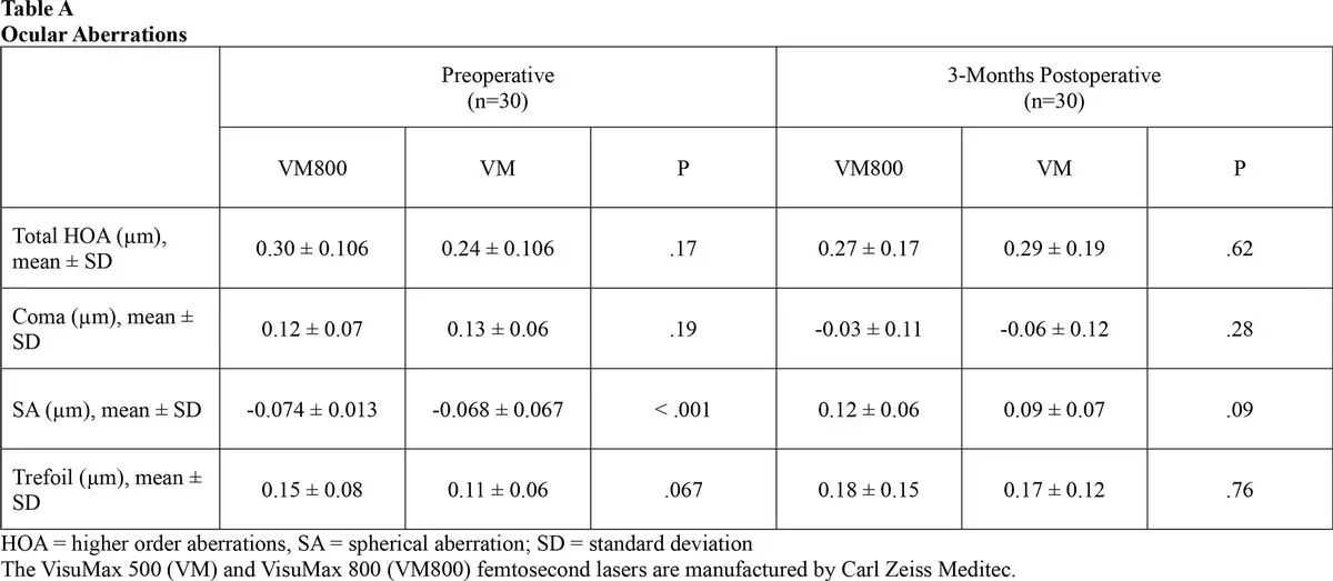 In addition, the mean postoperative UDVA, CDVA, SE, cylinder, OSI, HOA, and contrast sensitivity were comparable between the VM800 and VM500 groups, reinforcing their initial assumptions that there is little difference with regard to visual outcomes between groups. This is due to the fact that the optics and laser delivery design of the VisuMax 800 are identical to that of the VisuMax 500, and therefore one would expect similar clinical outcomes between the two devices.