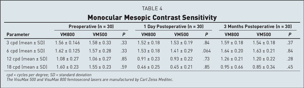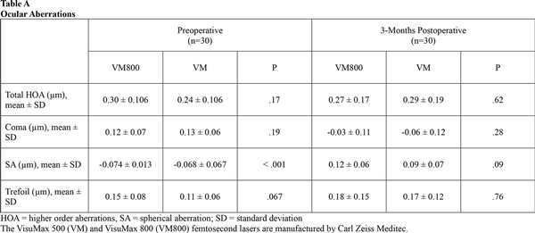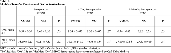 Table 4 shows the mean preoperative and postoperative values for contrast sensitivity. Both groups were similar at the 3-month visit. Eyes in both groups also showed similar results when compared to their preoperative levels at 3, 6, and 12 cycles per degree. At 18 cycles per degree, there was a slight decrease noted for both groups when compared to the preoperative levels. Table A show the preoperative and 3-month postoperative aberrations including total HOAs, coma, spherical aberration, and trefoil for both groups. Table B shows the MTF and OSI at the preoperative, 1-day, and 3-month postoperative visits. There were no significant differences found between groups for either of these categories. There was a slight increase in OSI and a slight decrease in MTF when comparing each group to its respective preoperative levels.