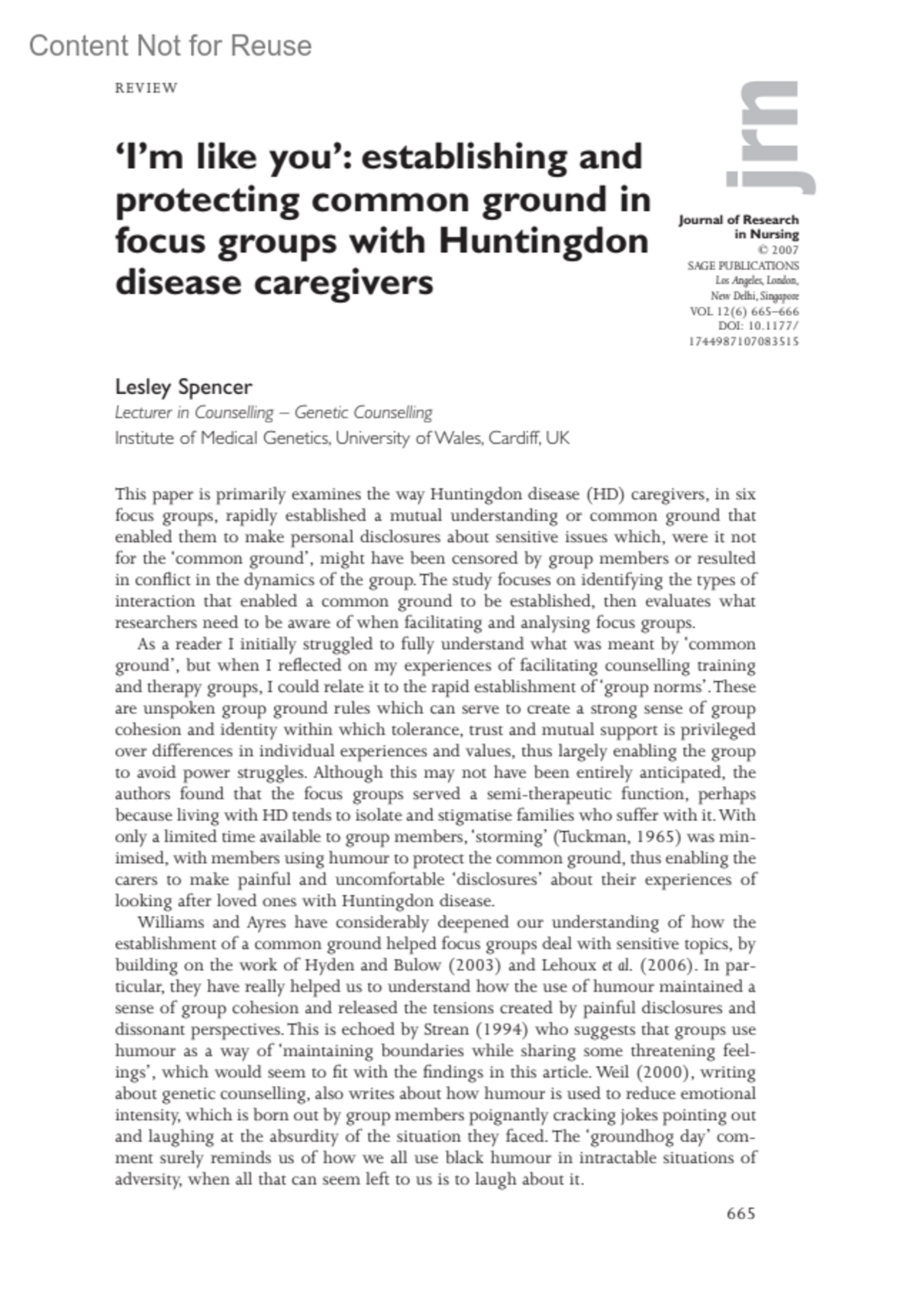 Lesley Spencer EdD (Narrative & Life Story Research) ongoing, MSc, CQSW, Diploma in Counselling, BA (hon). Lesley Spencer has been a Senior Lecturer in Counselling with the University of Wales, Newport since 1994, where she trains counselling and clinical supervision students to Masters level. She has worked as a counsellor for 20 years, including 10 years in primary care. In 2000, she was part of the core team that developed the MSc in Genetic Counselling at the University of Cardiff and her responsibilities are for the counselling and communication skills aspects of the programme. Since 2004, she has been the clinical supervisor for the SE Wales Genetic Counselling Service and her research interests include counselling training, the psychosocial aspects of genetic counselling and narrative research. E-mail: [email protected]