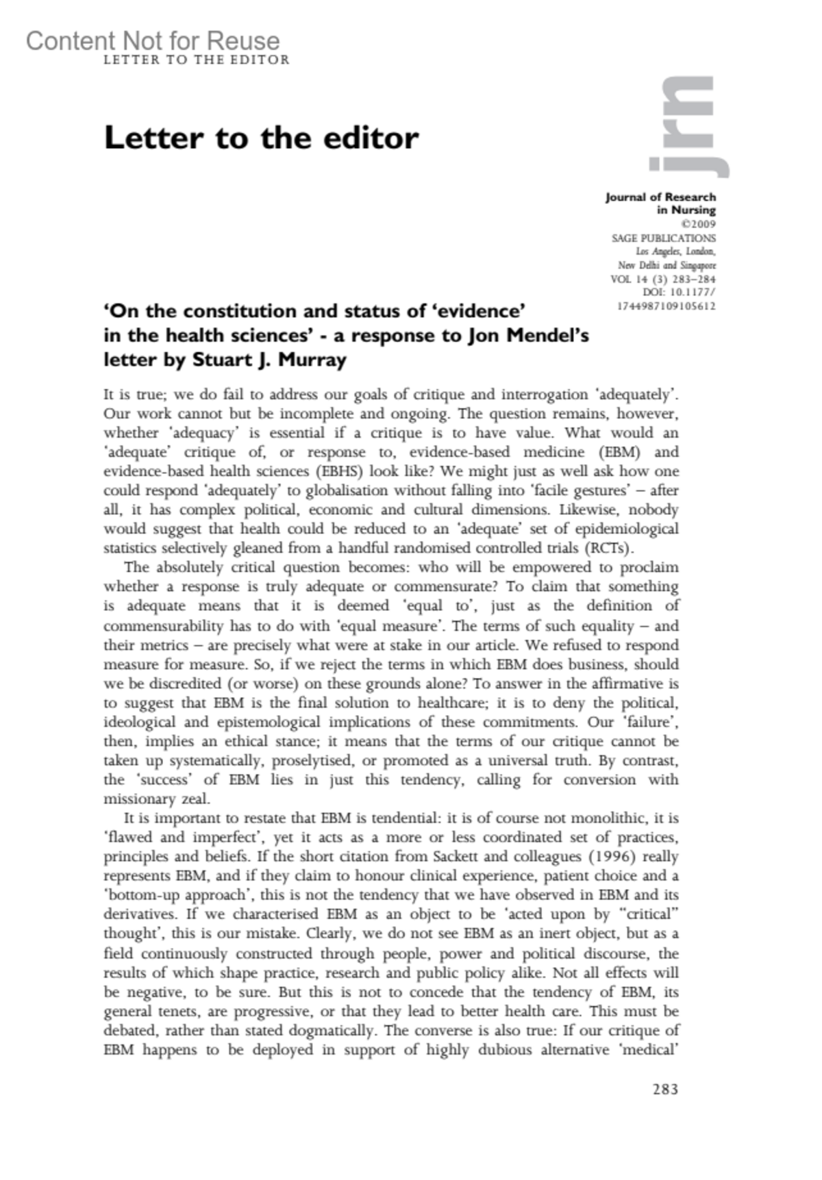 ‘On the constitution and status of ‘evidence’ in the health sciences’ — a response to Jon Mendel's letterMurray, Stuart J.Author informationAssistant Professor, Faculty of Arts and School of Graduate Studies, Ryerson University, Toronto, Ontario, CanadaEmail: [email protected]Journal of Research in Nursing 14(3):p 283-284, May 2009.Copyright ©2009Sage Publications