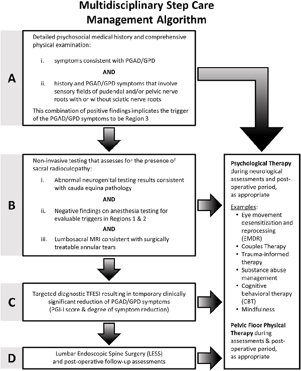 Due to the multiple possible regions of PGAD/GPD pathology (genital, pelvis/perineum, cauda equina, spinal cord, and brain), we recognized the need for a logical diagnostic sequence (Figure 1) to evaluate that subgroup of patients with PGAD suspected of having an annular tear–induced sacral radiculopathy contributing to their condition (Figure 2). Use of this step-care management algorithm enabled careful selection of patients for the LESS procedure.