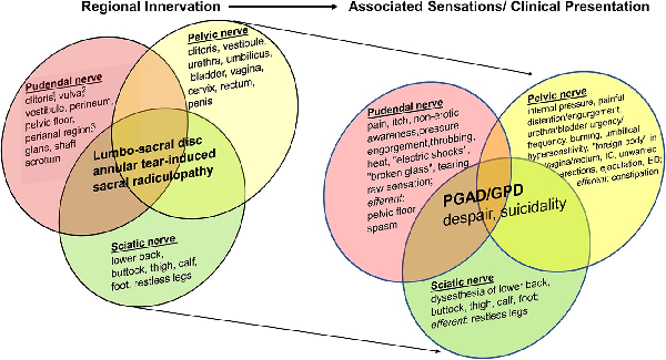There are some characteristics in common between PGAD/GPD and cauda equina syndrome (CES). Both involve irritation of sacral nerve root fibers of passage through the lumbar region that convey sensation perceived as originating from the genitopelvic area and lower extremities. However, there are 2 major differences between these conditions. CES is an emergency due to severe lumbosacral disc herniation that acutely compromises the integrity of the lumbosacral nerve roots. CES involves efferent dysfunction (eg, bladder and bowel) with some perceptual pain or numbness in the lower extremity. The CES literature occasionally refers to sexual medicine disorders in men, such as erectile dysfunction, but rarely references sexual dysfunction in women. By contrast, PGAD/GPD is a chronic sexual medicine condition of relatively low-level nerve root irritation that can result in a range of genitopelvic abnormal afferent sensations.