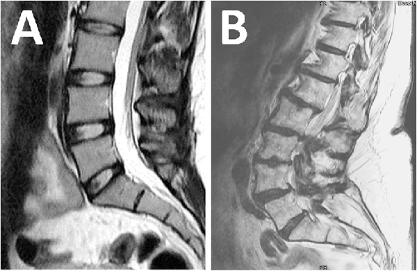 Magnetic resonance imaging: (A) normal findings with no pathology; (B) abnormal findings with multiple abnormalities not suitable for surgery.