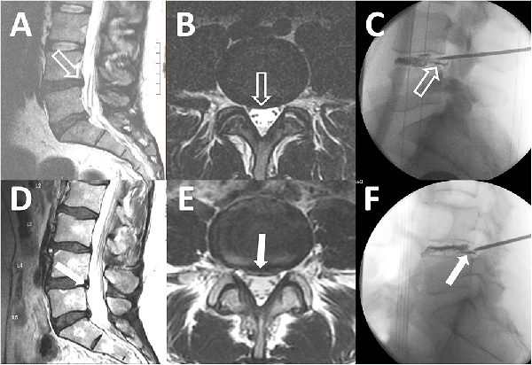 Subtle and obvious annular tears. T2 sagittal magnetic resonance imaging (MRI), T2 axial MRI, and the corresponding intraoperative discogram images show annular tears in patients with a subtle annular tear (A-C) and an obvious annular tear (D-F). A small bulging disc at L4-L5 without an associated high-intensity zone (HIZ) is indicated in panels A and B (open white arrows). Intraoperative discogram images reveal leakage of contrast through the annular tear (C, open white arrow). A bulging disc with an obvious HIZ is highlighted in panels D and E (solid white arrows). Intraoperative discogram images demonstrate leakage of contrast through the annular tear corresponding to the HIZ on MRI (F, solid white arrow). Note that there are also obvious annular tears at L5-S1 in panels A and D.
