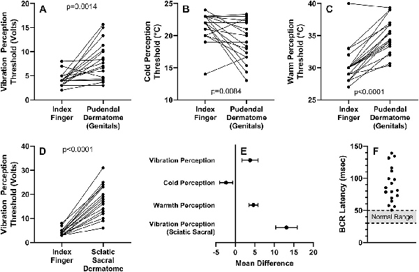 Neurogenital testing results. Integrity of the dorsal and perineal branches of the pudendal nerve was assessed by genital sensation threshold to vibration (A) and to cold (B) and warm (C) temperatures. Sciatic nerve integrity was assessed by sacral dermatome sensation threshold to vibration (D). (E) Mean differences (95% CIs) between test sites and reference control (index finger) for quantitative sensory testing values. (F) Bulbocavernosus reflex (BCR) latency values in the study group with the reference range indicated by the shaded region.