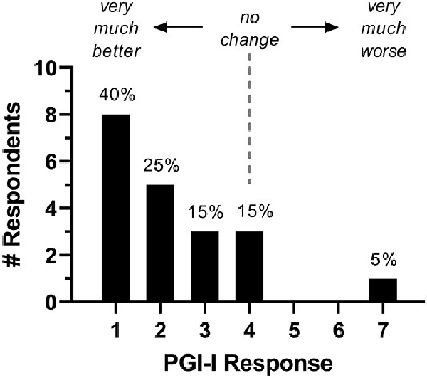 The average follow-up was 20 months (range, 12-37 months). There were no surgical complications based on the Clavien-Dindo classification system (grades 1-5).,, At most recent follow-up, 16 of 20 patients (80%) reported improvement on the PGI-I (score of 1, 2, or 3; Figure 6), with 65% (13/20) indicating significant improvement (PGI-I score 1 or 2). PGI-I scores were not significantly different between patients with subtle and obvious annular tears. However, patients with acquired PGAD/GPD had a median postoperative PGI-I score of 1.5 (n = 16) as opposed to 3.5 (n = 4) for those with lifelong PGAD/GPD. Individual scores over time are presented in Figure 7. Among 13 patients for whom data were available within 3 months of surgery, 11 (85%) reported improvement per the PGI-I; 9 (69%) of whom had a score of 1 or 2 (very much better or much better). One patient indicated no change for 6 months after surgery but subsequently experienced worsening of her condition.