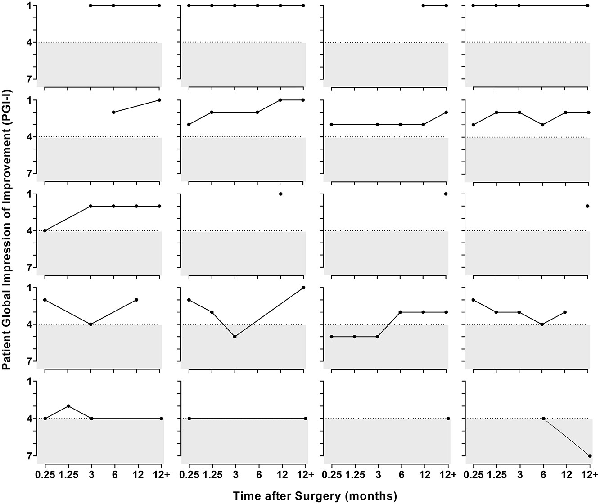 Time course of PGI-I scores in individual patients after surgery. PGI-I, Patient Global Impression of Improvement.