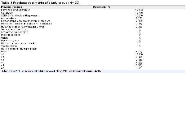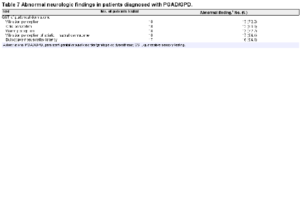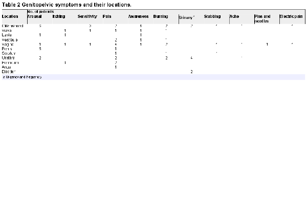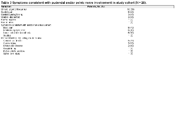 Many patients with PGAD in this cohort had concomitant symptoms and histories indicative of sciatic or pelvic nerve involvement (Table 3). Symptoms consistent with the sensory fields and functions of the sciatic nerves included back pain (40%), restless leg syndrome (30%), and lower extremity dysesthesia (30%). Symptoms consistent with the sensory fields and functions of the pelvic nerves were urinary urgency/frequency (50%) and urethral discomfort (15%). Symptoms consistent with the sensory fields and functions of the pudendal nerves consisted of genital pain (40%) and genital burning/itching (15%).