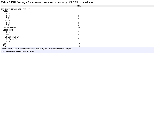Based on MRI findings, a total of 22 LESS procedures were performed in 20 patients (Table 8). One patient had bilateral annular tears and underwent LESS on the left side, followed by LESS on the right side 6 months later. Another patient had a fall 1 month after surgery that reactivated her symptoms, and she underwent a repeat LESS procedure at 4.5 months after the first operation. All patients were discharged the same day, with no readmissions.