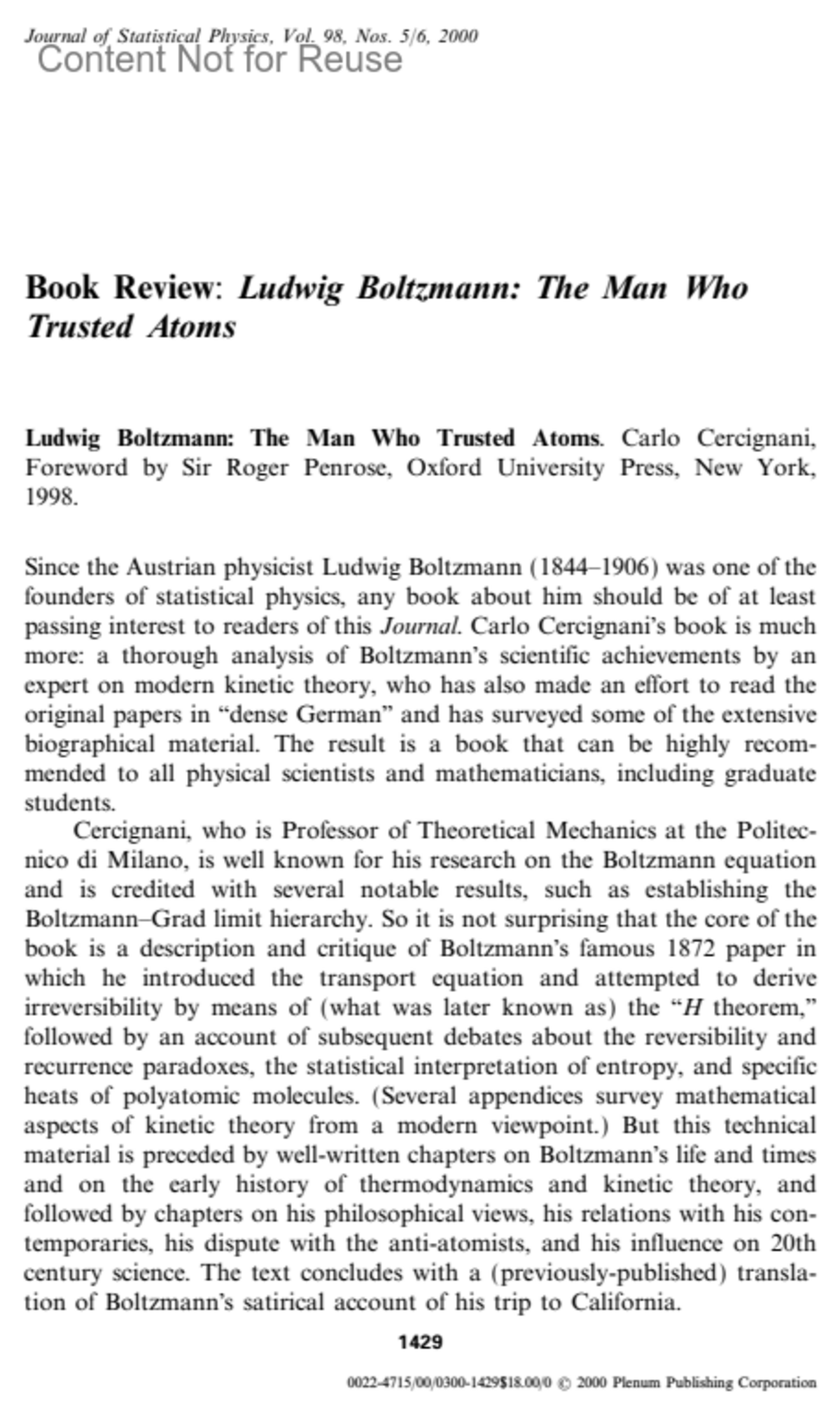 Ludwig Boltzmann: The Man Who Trusted Atoms.