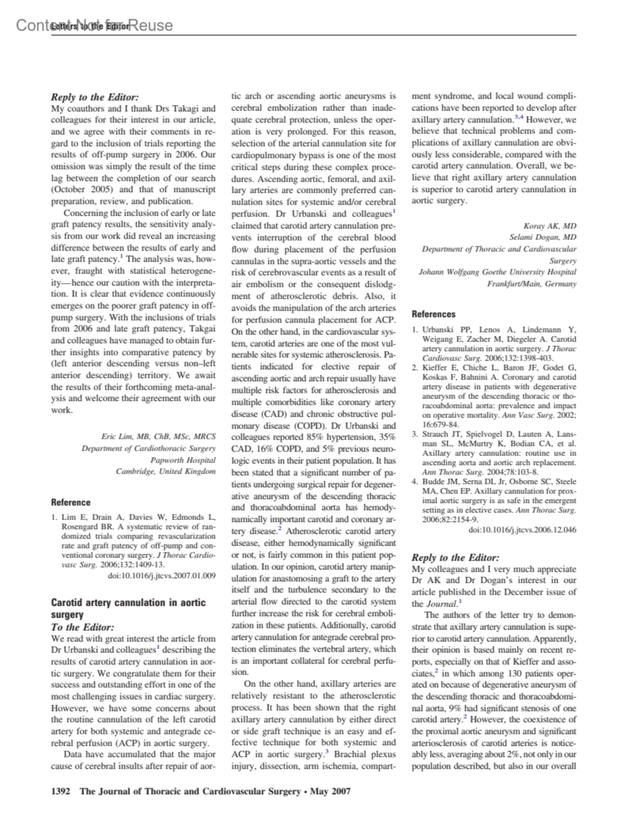 Carotid artery cannulation in aortic surgeryUrbanski, Paul MD, PhDAuthor informationHerz- und Gefaess-Klinik Bad Neustadt, GermanyJournal of Thoracic & Cardiovascular Surgery 133(5):p 1392-1393, May 2007.Copyright © Mosby-Year Book Inc. 2007. All Rights Reserved.