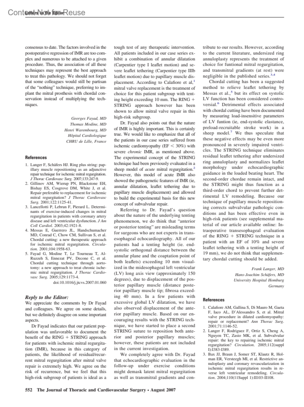 Ring, string, chordal cuttingAll or nothing?Langer, Frank MDSchäfers, Hans-Joachim MDAuthor informationUniversity Hospital Homburg, GermanyJournal of Thoracic & Cardiovascular Surgery 134(2):p 552-553, August 2007.Copyright © Mosby-Year Book Inc. 2007. All Rights Reserved.