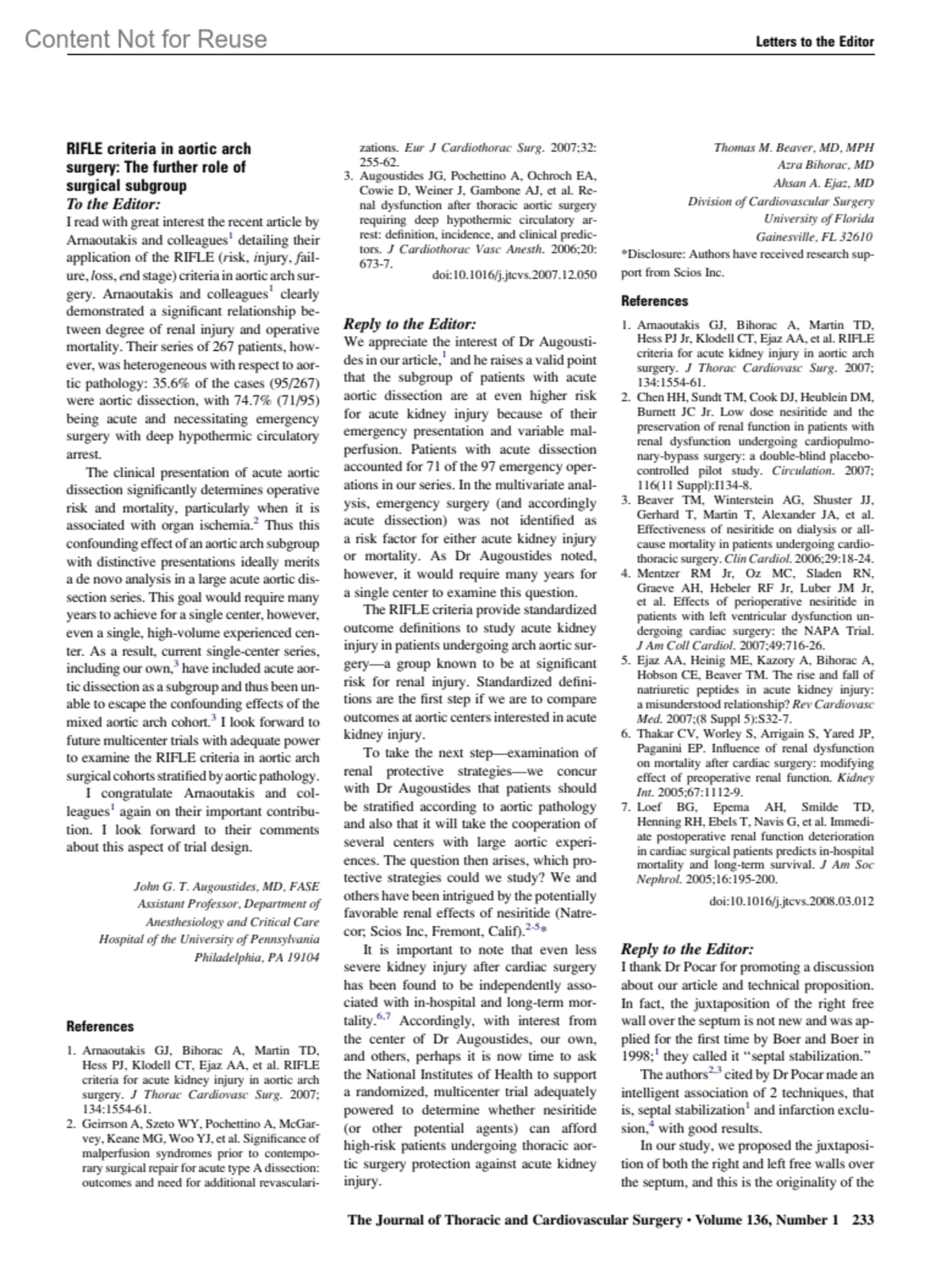 RIFLE criteria in aortic arch surgeryThe further role of surgical subgroupGerola, Luis R.Author informationGainesville, FLJournal of Thoracic & Cardiovascular Surgery 136(1):p 233-234, July 2008.Copyright © Mosby-Year Book Inc. 2008. All Rights Reserved.