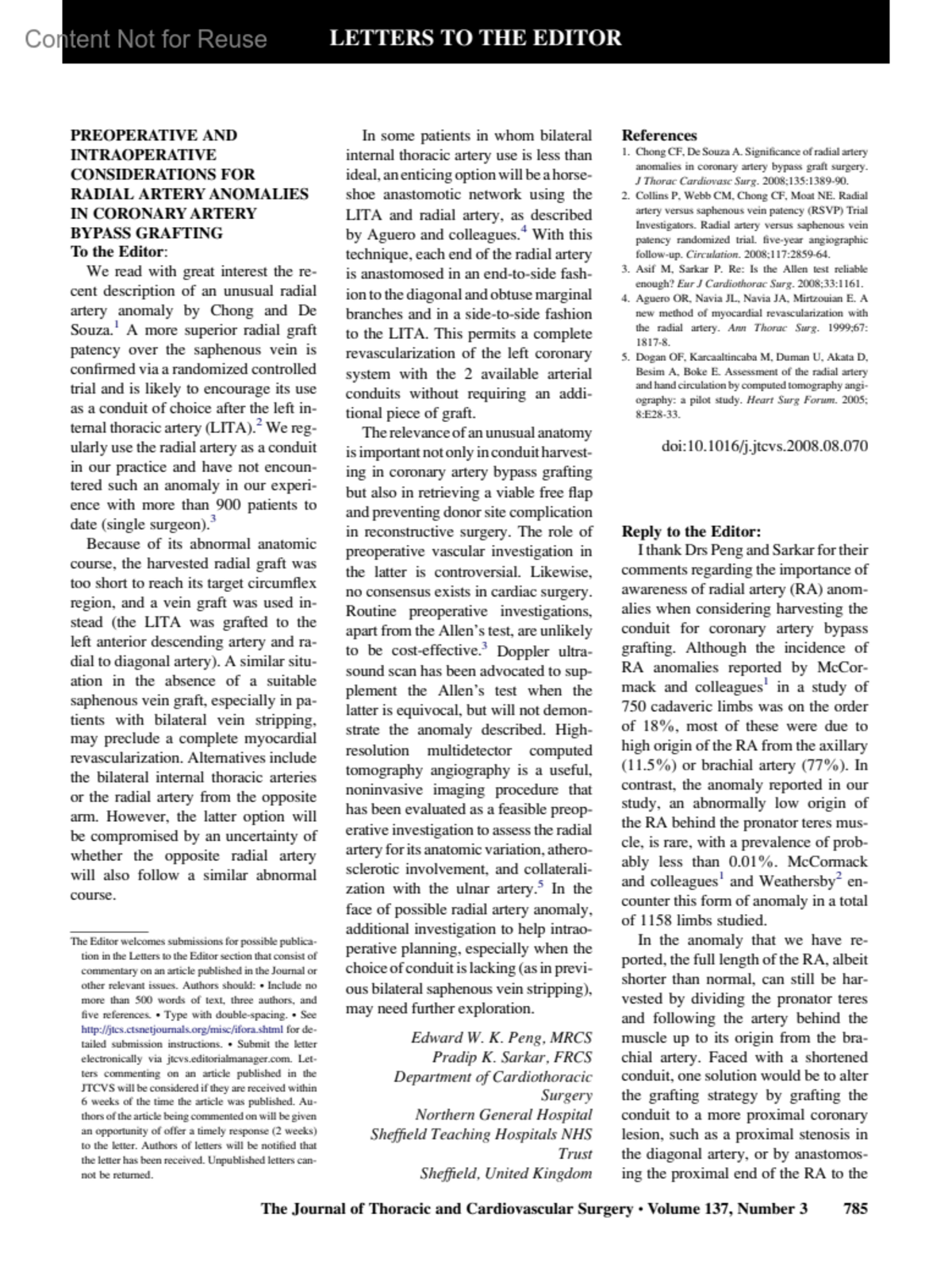 Journal of Thoracic & Cardiovascular Surgery 137(3):p 785-786, March 2009.