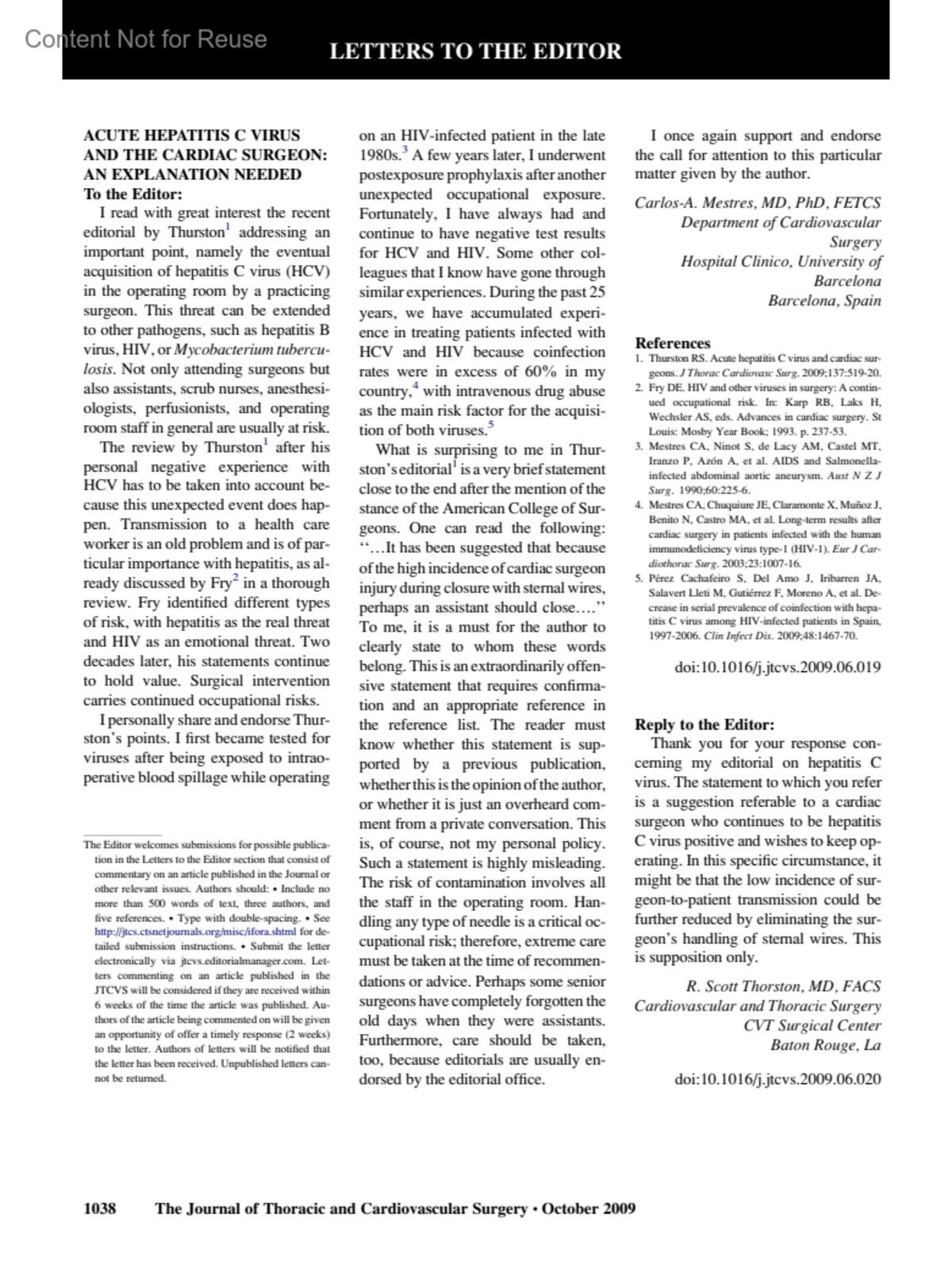 ACUTE HEPATITIS C VIRUS AND THE CARDIAC SURGEONAN EXPLANATION NEEDEDThorston, Scott R. MD, FACSAuthor informationCardiovascular and Thoracic Surgery, CVT Surgical Center, Baton Rouge, LaJournal of Thoracic & Cardiovascular Surgery 138(4):p 1038, October 2009.Copyright © Mosby-Year Book Inc. 2009. All Rights Reserved.
