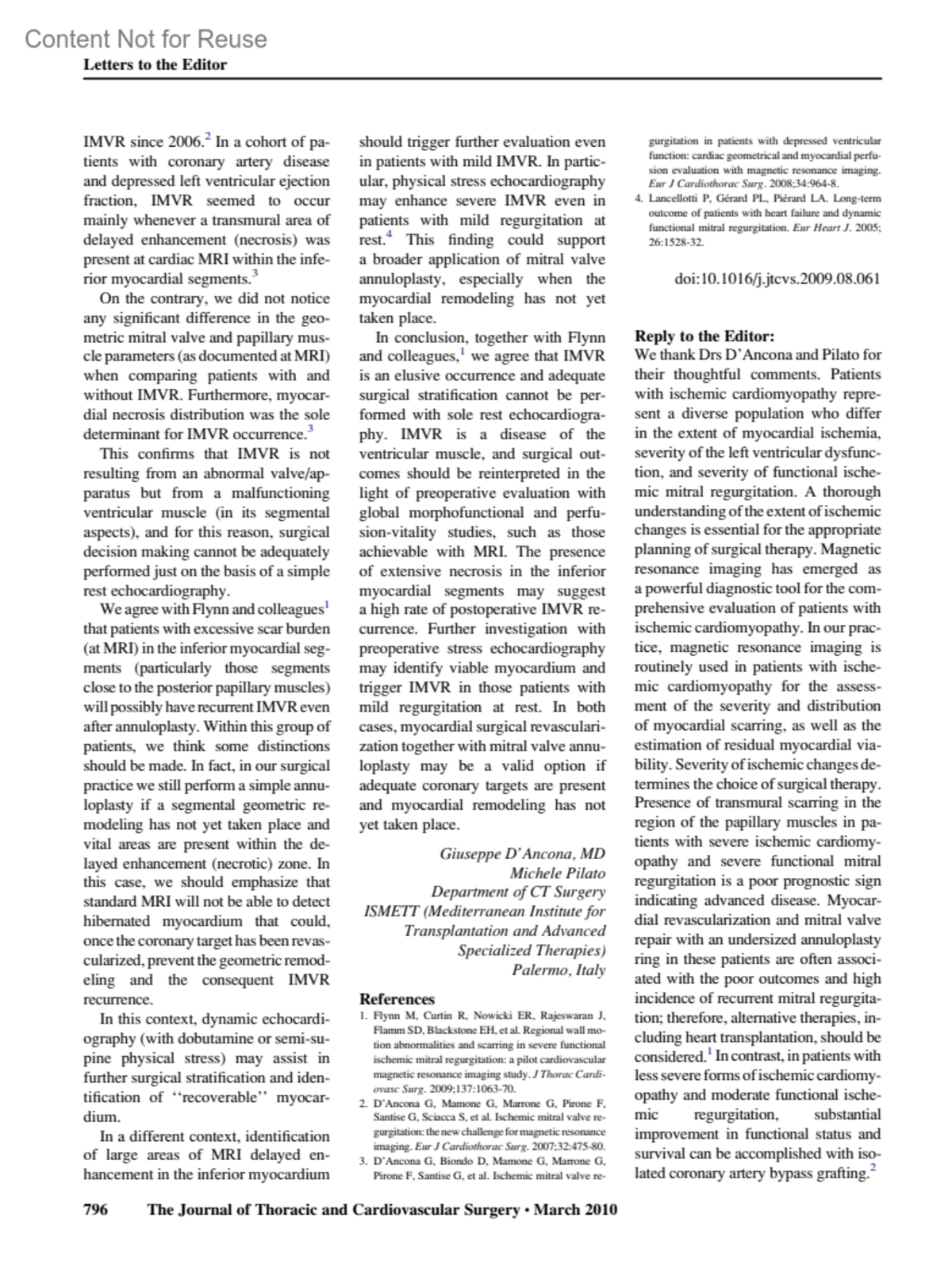 Journal of Thoracic & Cardiovascular Surgery 139(3):p 796-797, March 2010.