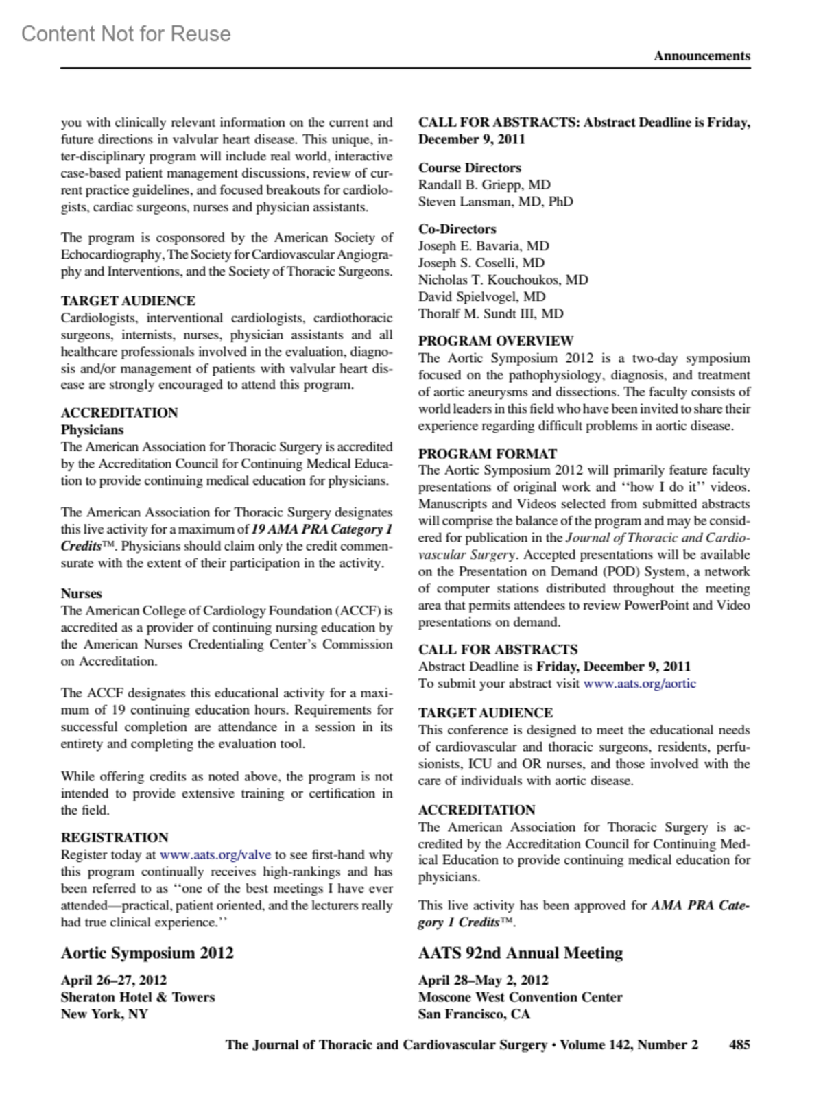 AATS 92nd Annual MeetingJournal of Thoracic & Cardiovascular Surgery 142(2):p 485-486, August 2011.Copyright © 2011Elsevier, Inc.