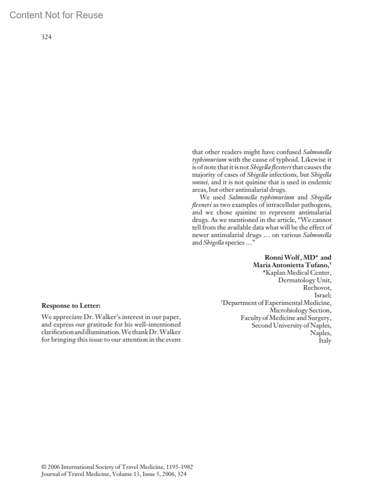 Quinine Sulfate Inhibits Invasion of Salmonella typhimurium and Shigella flexneriA Preliminary StudyWolf, Ronni MDTufano, Maria AntoniettaAuthor information*Kaplan Medical Center, Dermatology Unit, Rechovot, Israel†Department of Experimental Medicine, Microbiology Section, Faculty of Medicine and Surgery, Second University of Naples, Naples, ItalyJournal of Travel Medicine 13(5):p 324, September-October 2006.Copyright © 2006 Blackwell Publishing Ltd.