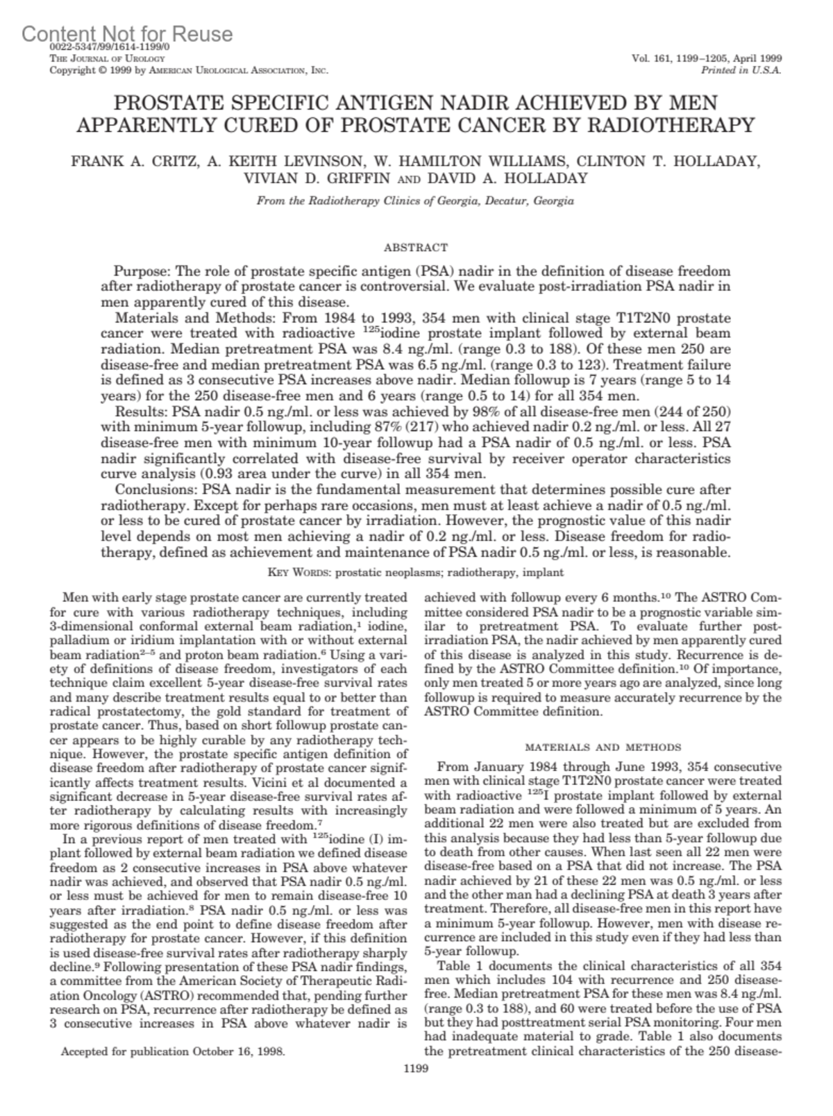 PROSTATE SPECIFIC ANTIGEN NADIR ACHIEVED BY MEN APPARENTLY CURED OF PROSTATE CANCER BY RADIOTHERAPYEDITORIAL COMMENTReiter, RobertAuthor informationDepartment of Urology; UCLA School of Medicine; Los Angeles, CaliforniaJournal of Urology 161(4):p 1203, April 1999.Copyright © 1999 by the American Urological Association, Inc.