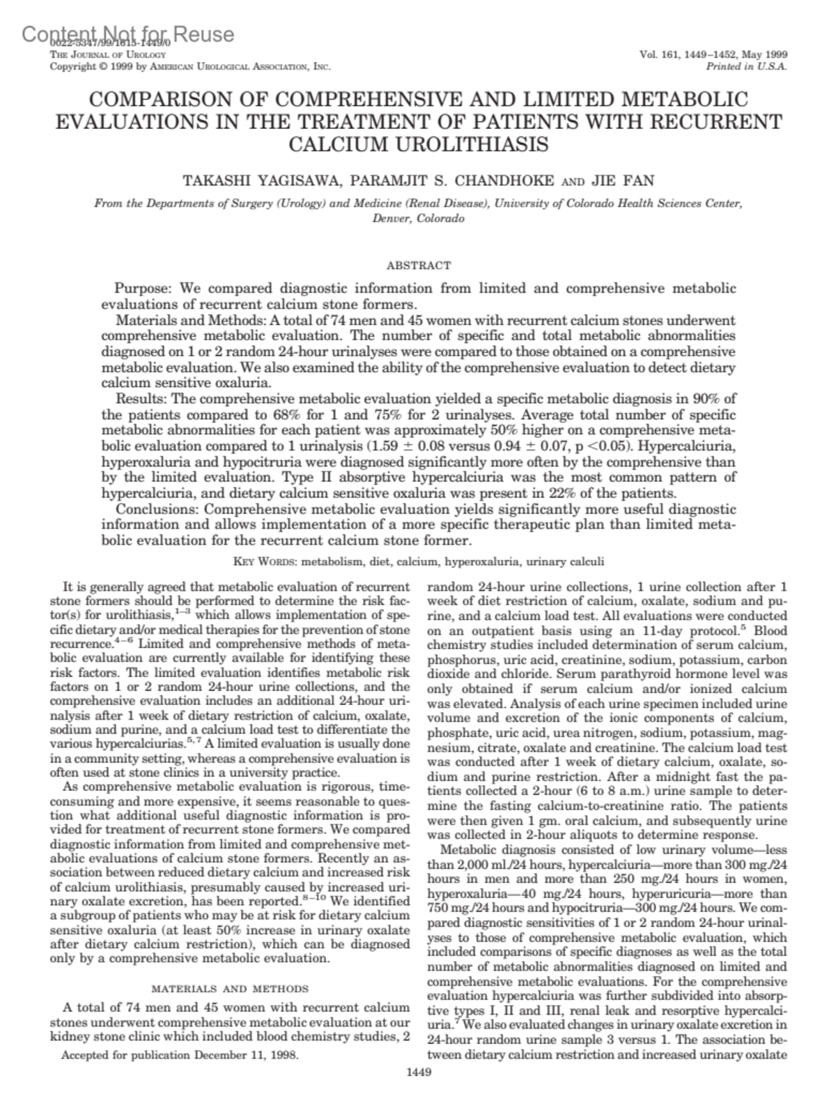 COMPARISON OF COMPREHENSIVE AND LIMITED METABOLIC EVALUATIONS IN THE TREATMENT OF PATIENTS WITH RECURRENT CALCIUM UROLITHIASIS