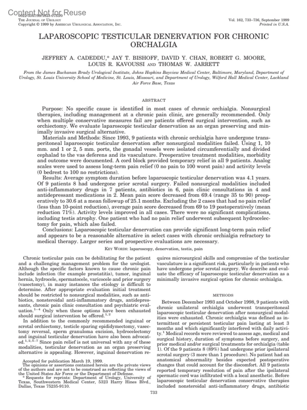 LAPAROSCOPIC TESTICULAR DENERVATION FOR CHRONIC ORCHALGIAEDITORIAL COMMENTKursch, Elroy D.Author informationDepartment of Urology-Lynhurst; Cleveland Clinic Foundation; Lynhurst, OhioJournal of Urology 162(3-I):p 735-736, September 1999.Copyright © 1999 by the American Urological Association, Inc.