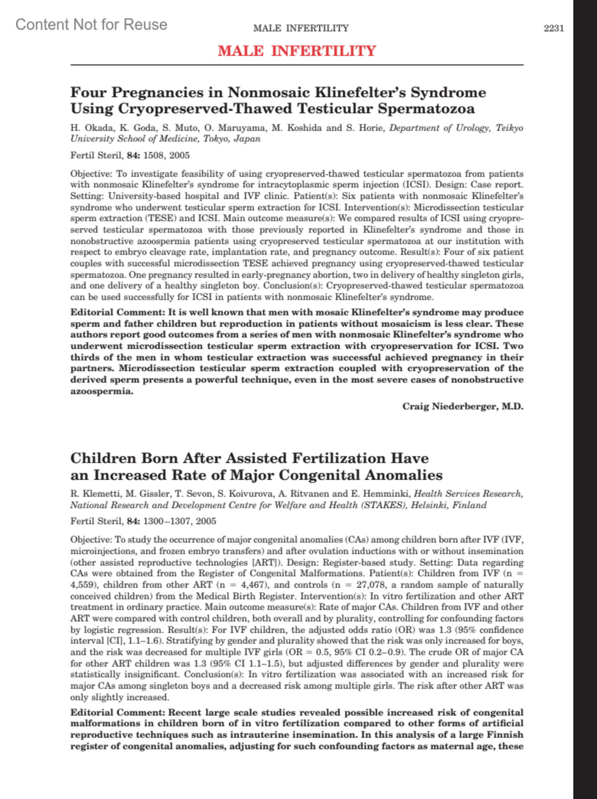 Four Pregnancies in Nonmosaic Klinefelter's Syndrome Using Cryopreserved-Thawed Testicular SpermatozoaNiederberger, Craig M.D.Journal of Urology 175(6):p 2231, June 2006.Copyright © 2006 by the American Urological Association, Inc.