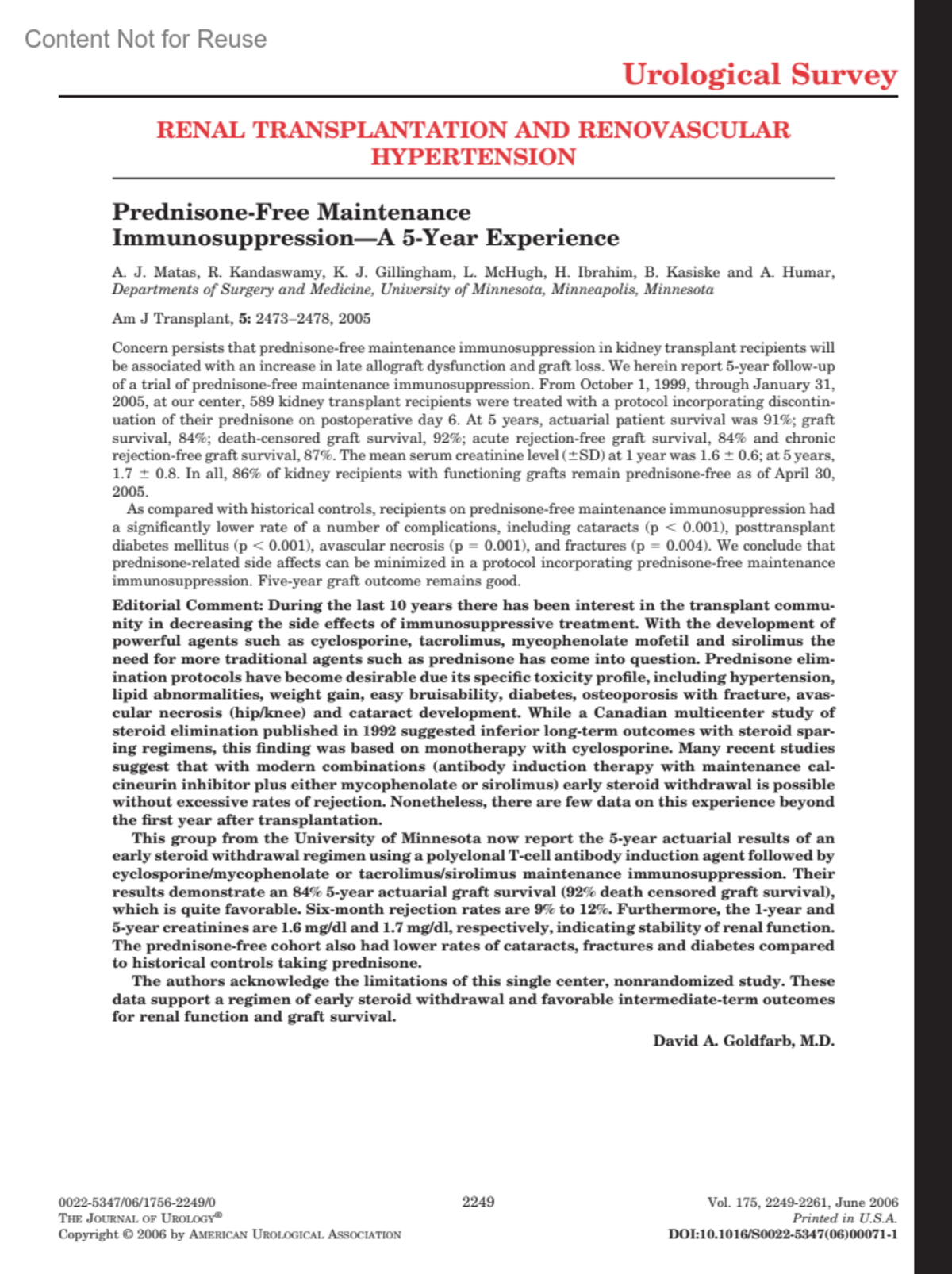 Prednisone-Free Maintenance Immunosuppression—A 5-Year ExperienceGoldfarb, David A. M.D.Journal of Urology 175(6):p 2249, June 2006.Copyright © 2006 by the American Urological Association, Inc.