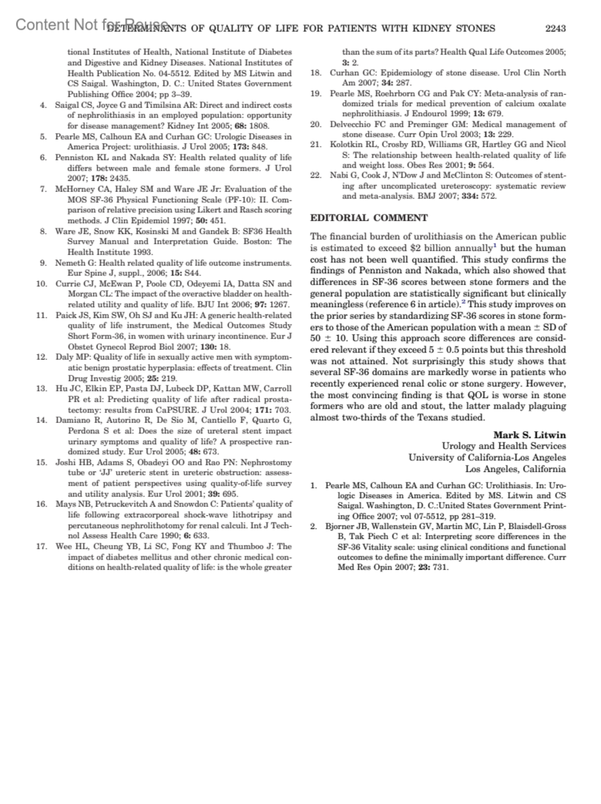Determinants of Quality of Life for Patients With Kidney StonesLitwin, Mark S.Author informationUrology and Health Services, University of California-Los Angeles, Los Angeles, CaliforniaJournal of Urology 179(6):p 2243, June 2008.Copyright © 2008 by the American Urological Association, Inc.