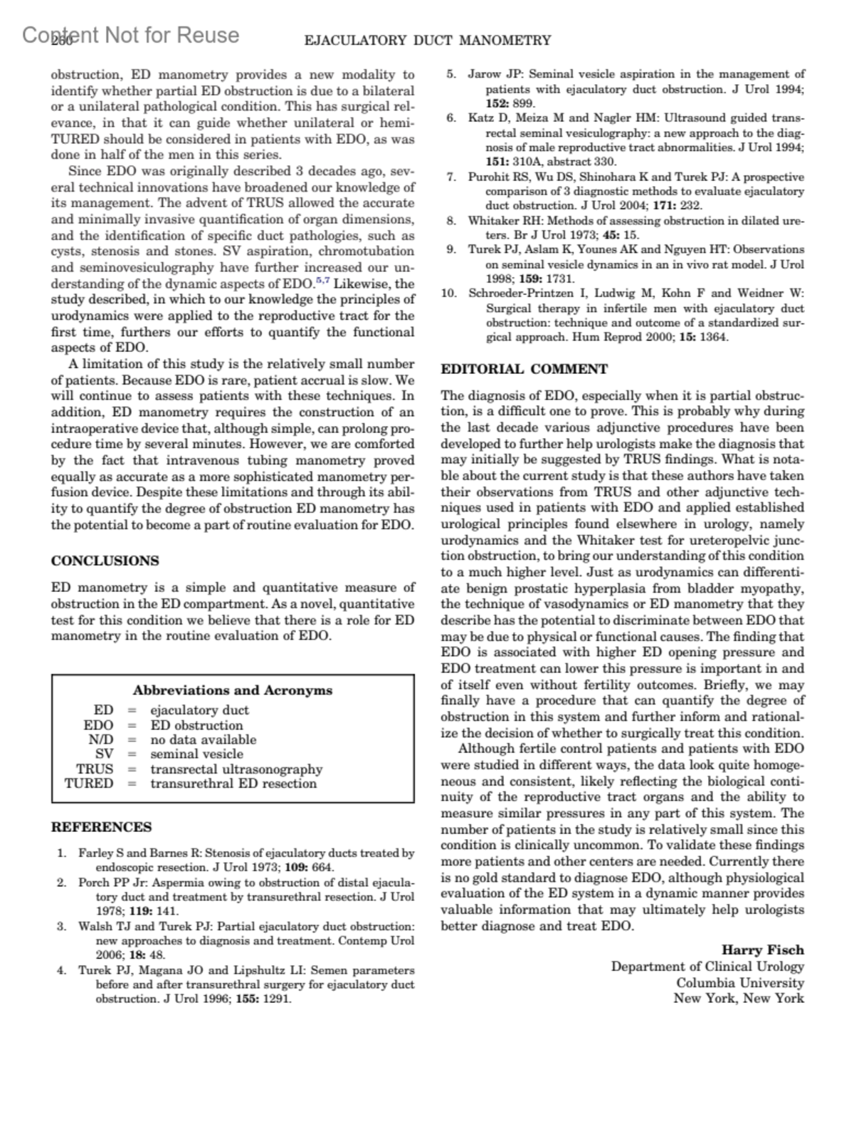 Ejaculatory Duct Manometry in Normal Men and in Patients With Ejaculatory Duct ObstructionFisch, HarryAuthor informationDepartment of Clinical Urology, Columbia University, New York, New YorkJournal of Urology 180(1):p 260, July 2008.Copyright © 2008 by the American Urological Association, Inc.
