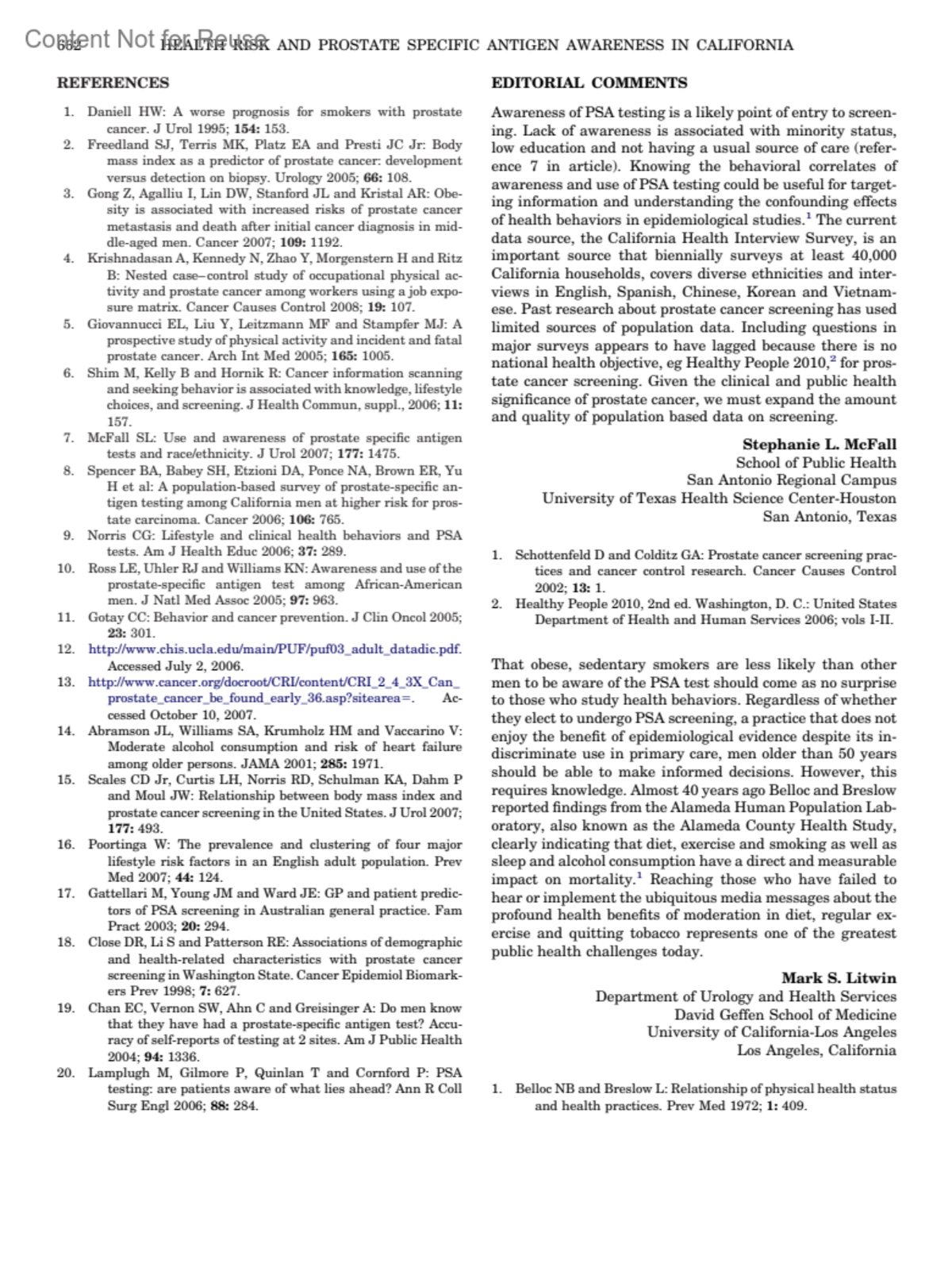 Health Risk Behaviors and Prostate Specific Antigen Awareness Among Men in CaliforniaMcFall, Stephanie L.Author informationSchool of Public Health, San Antonio Regional Campus, University of Texas Health Science Center-Houston, San Antonio, TexasJournal of Urology 180(2):p 662, August 2008.Copyright © 2008 by the American Urological Association, Inc.