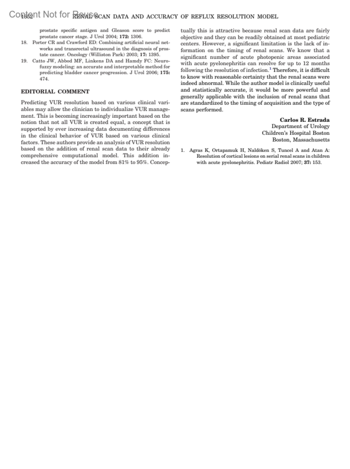 Adding Renal Scan Data Improves the Accuracy of a Computational Model to Predict Vesicoureteral Reflux ResolutionEstrada, Carlos R.Author informationDepartment of Urology, Children's Hospital Boston, Boston, MassachusettsJournal of Urology 180(4):p 1652, October 2008.Copyright © 2008 by the American Urological Association, Inc.