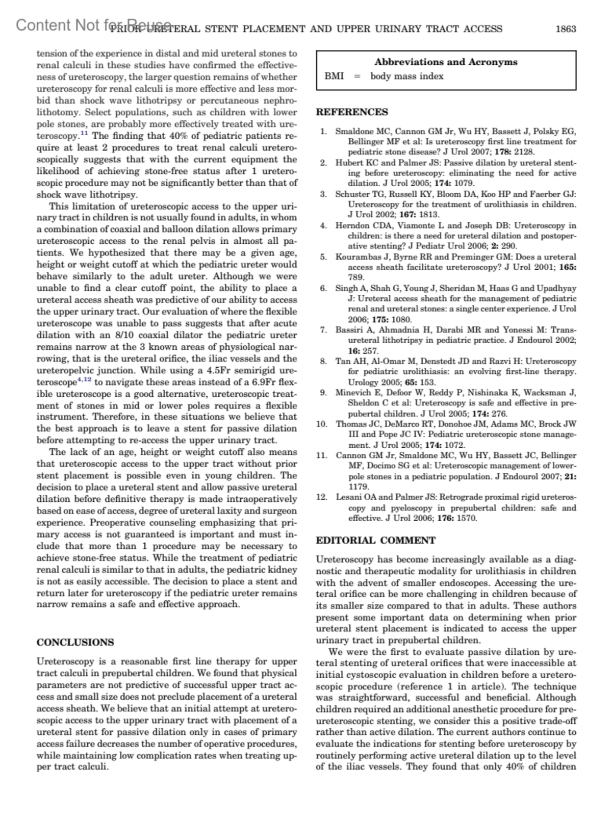 When is Prior Ureteral Stent Placement Necessary to Access the Upper Urinary Tract in Prepubertal Children?Palmer, Jeffrey S.Author informationCenter for Pediatric Urology, Glickman Urological and Kidney Institute, Cleveland Clinic, Cleveland, OhioJournal of Urology 180(4):p 1863-1864, October 2008.Copyright © 2008 by the American Urological Association, Inc.