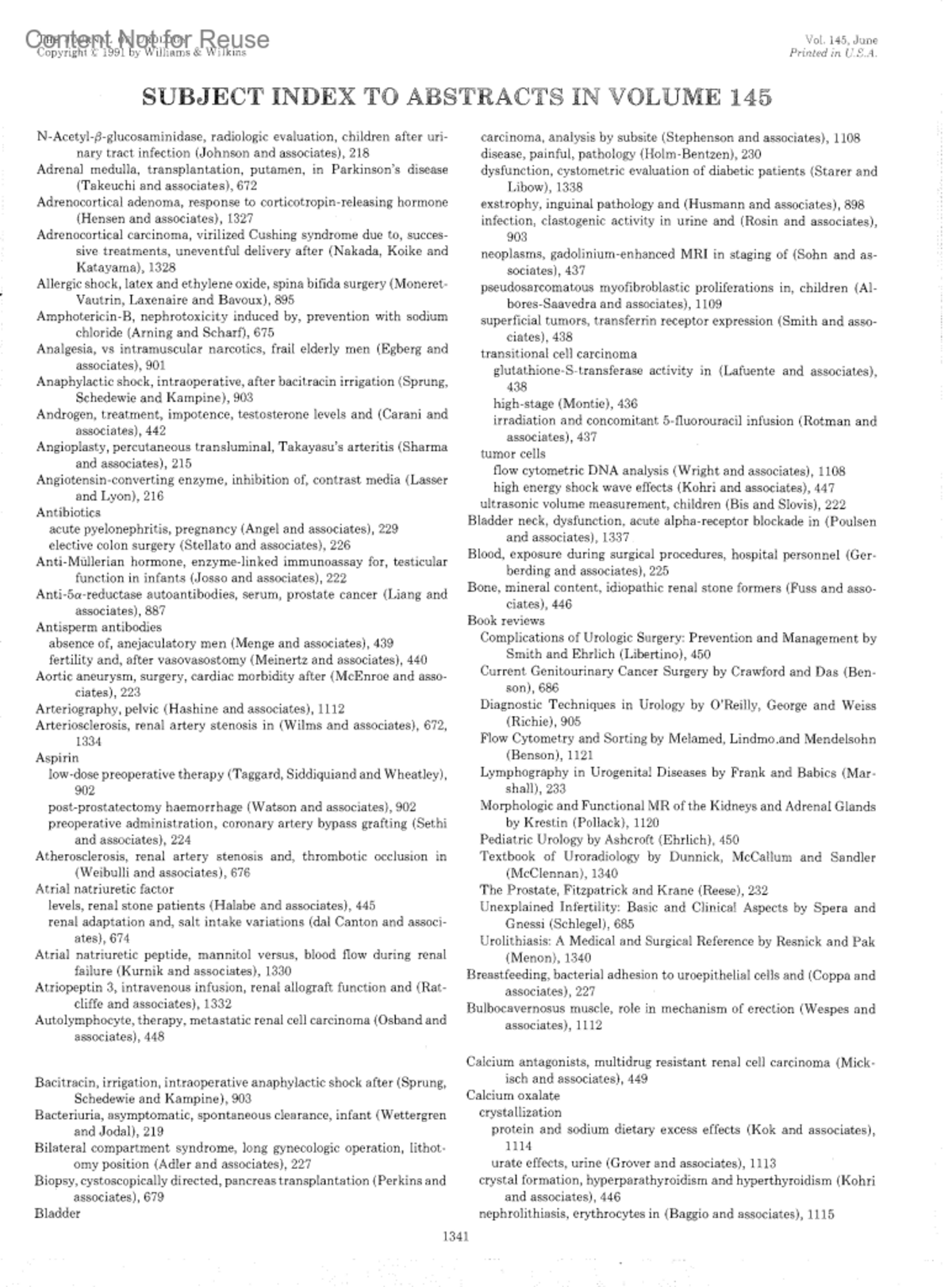 Subject Index to Abstracts in Volume 145Journal of Urology 145(6):p 1341-1347, June 1991. | DOI: 10.1016/S0022-5347(17)38629-9Copyright © 1991 by the American Urological Association, Inc.