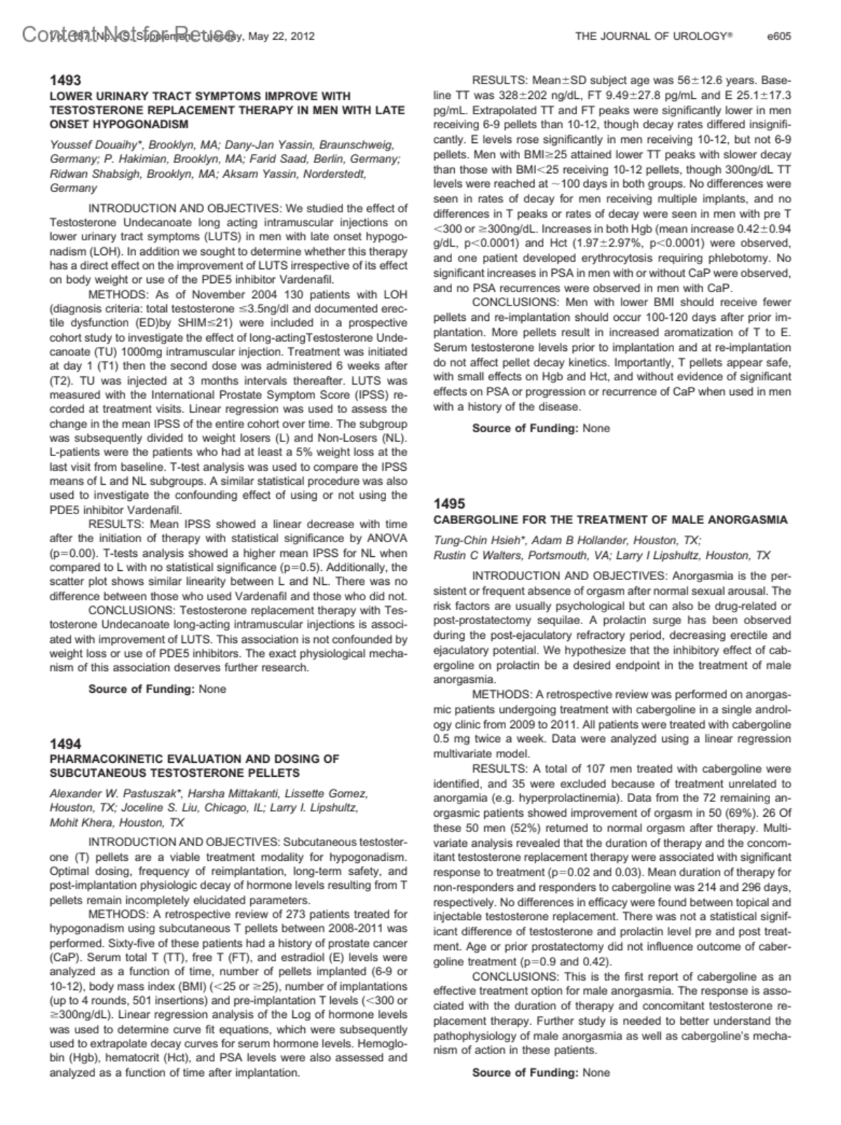 Journal of Urology 187(4):p e605, April 2012.