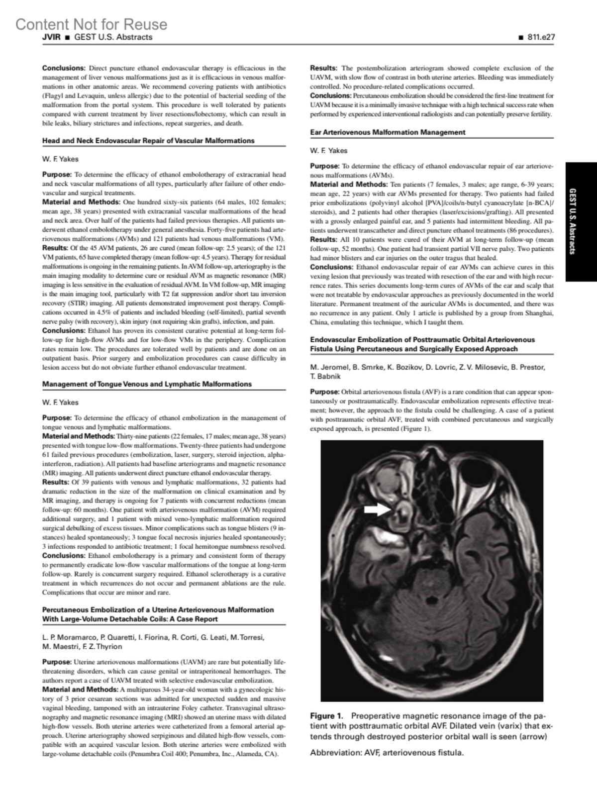 Head and Neck Endovascular Repair of Vascular MalformationsYakes, W. F.Journal of Vascular & Interventional Radiology 25(5):p 811e27, May 2014.Copyright © Copyright 2014 Society of Cardiovascular & Interventional Radiology