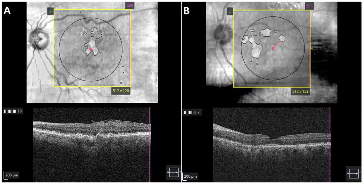 Optical coherence tomography of automated subretinal pigment epithelium illumination showing outlines of (A) a fovea-involving lesion with geographic atrophy (GA) and (B) an extrafoveal GA lesion in patients diagnosed with intermediate age-related macular degeneration.