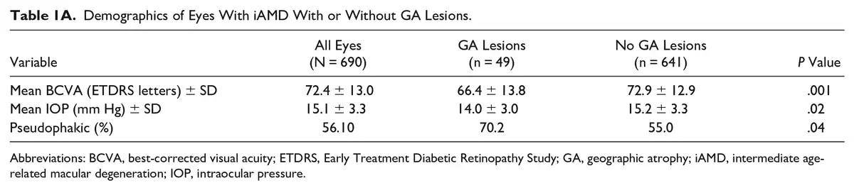 The study assessed 1260 of 630 patients for study inclusion. For the final analysis, 91 eyes (7.2% of initial eyes screened for inclusion) were excluded. In total, 690 eyes of 428 patients remained after exclusion (Figure 2). The mean age of the included patients was 79.4 ± 8.4 years. Men comprised 33.6% of the patients, and 94.4% were White. Patients with GA lesions were older on average than patients without lesions (83.4 ± 7.7 years vs 78.9 ± 8.4 years; P = .001). The mean best-corrected VA (BCVA) across the sample was 72.4 ± 13.0 letters (Snellen equivalent, 20/35) and was significantly better in patients without GA lesions (P = .001). Patients with lesions were more likely than those without lesions to be pseudophakic (70.2% vs 55.0%). Table 1A shows a detailed analysis eye demographics and Table 1B, of patient demographics.