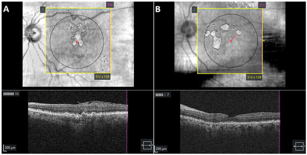 Optical coherence tomography of automated subretinal pigment epithelium illumination showing outlines of (A) a fovea-involving lesion with geographic atrophy (GA) and (B) an extrafoveal GA lesion in patients diagnosed with intermediate age-related macular degeneration.