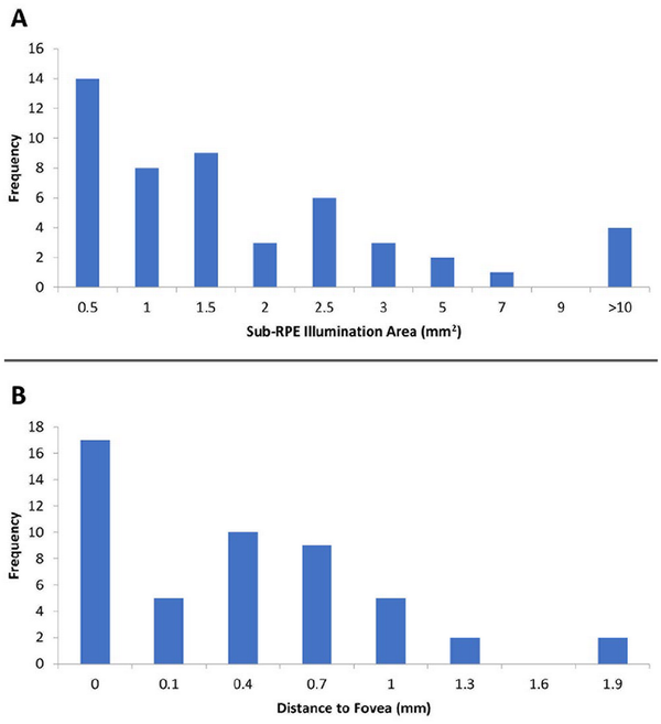 Distribution of (A) lesion sizes and (B) foveal distances.