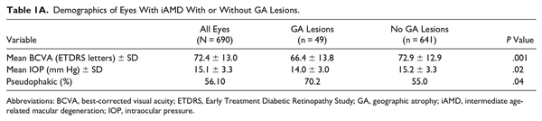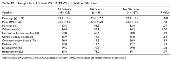 The study assessed 1260 of 630 patients for study inclusion. For the final analysis, 91 eyes (7.2% of initial eyes screened for inclusion) were excluded. In total, 690 eyes of 428 patients remained after exclusion (Figure 2). The mean age of the included patients was 79.4 ± 8.4 years. Men comprised 33.6% of the patients, and 94.4% were White. Patients with GA lesions were older on average than patients without lesions (83.4 ± 7.7 years vs 78.9 ± 8.4 years; P = .001). The mean best-corrected VA (BCVA) across the sample was 72.4 ± 13.0 letters (Snellen equivalent, 20/35) and was significantly better in patients without GA lesions (P = .001). Patients with lesions were more likely than those without lesions to be pseudophakic (70.2% vs 55.0%). Table 1A shows a detailed analysis eye demographics and Table 1B, of patient demographics.