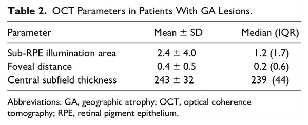 Although our study relied on OCT imaging and specifically sub-RPE illumination area analysis, this technology is not without drawbacks. Of 129 eyes, there were 50 instances of false positives with a sub-RPE illumination area greater than 0.4 mm2 (38.8%), where the sub-RPE illumination analysis detected atrophy that was deemed by the graders not to be atrophy. Anecdotally, this was often the result of choroidal atrophy, high myopia, subtle epiretinal membranes, and the presence of vitelliform lesions. Thus, although OCT can be a useful tool, it does not replace image analysis by a physician.