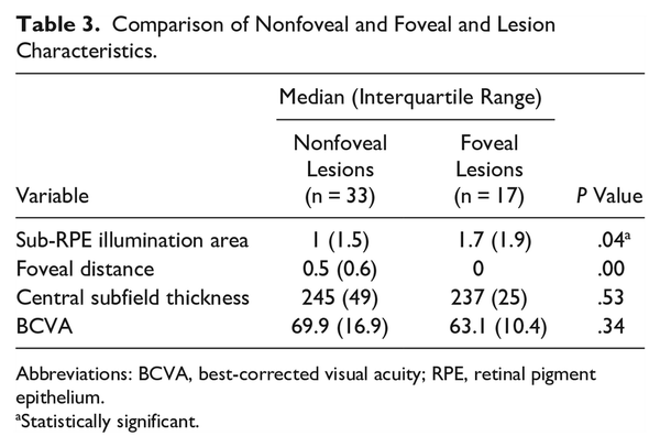 Forty-one (83.7%) of 49 images were reshaded. The mean lesion area after reshading of lesions identified through OCT analysis was 2.4 ± 4.0 mm2 while the mean foveal distance was 0.4 ± 0.5 mm (Table 2). Figure 4A shows the distribution of GA lesion sizes, and Figure 4B shows the foveal distances across the sample of eyes with GA lesions. The overall mean CST in eyes with GA lesions was 243 ± 32 µm (Table 2). Thirty-four percent of eyes with GA lesions exhibited foveal involvement, defined as a foveal distance of 0 mm. Compared with nonfoveal lesions, the median foveal lesion size was larger (1.7 mm2 vs 1.0 mm2; P = .04); however, there was no difference in CST (Table 3). In addition, although the median BCVA was better in patients with nonfoveal lesions than in those with foveal lesions (69.9 letters [Snellen equivalent, 20/40] vs 63.1 letters [Snellen equivalent, 20/55]), the difference was not statistically significant (P = .34).
