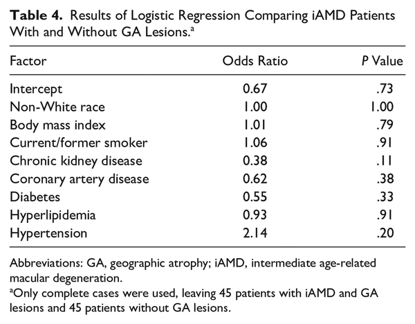 Four eyes in the GA lesion group were missing at least 1 factor of interest in the regression analysis, leaving 45 eyes. Forty-five age-matched and sex-matched control eyes with iAMD and no GA lesions were identified. Table 4 shows the results of the logistic regression analysis used to identify risk factors for GA lesions. None of the factors was found to significantly affect the odds of a patient diagnosed with iAMD having a GA lesion.