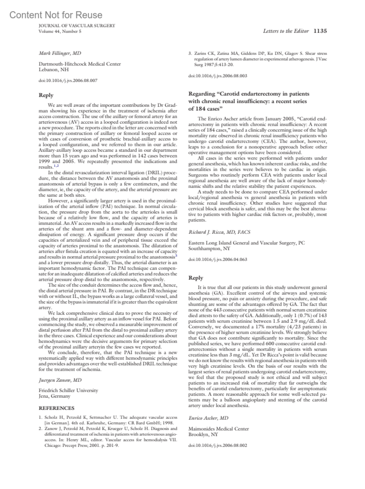 Regarding “Carotid endarterectomy in patients with chronic renal insufficiency: a recent series of 184 cases”Ascher, Enrico MDAuthor informationMaimonides Medical Center, Brooklyn, NYJournal of Vascular Surgery 44(5):p 1135, November 2006.Copyright © 2006Elsevier, Inc.