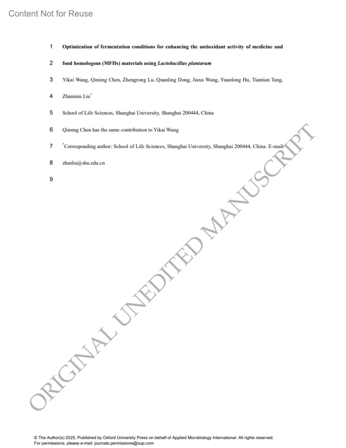 Optimization of fermentation conditions for enhancing the antioxidant activity of medicine and food homologous (MFHs) materials using Lactobacillus plantarum