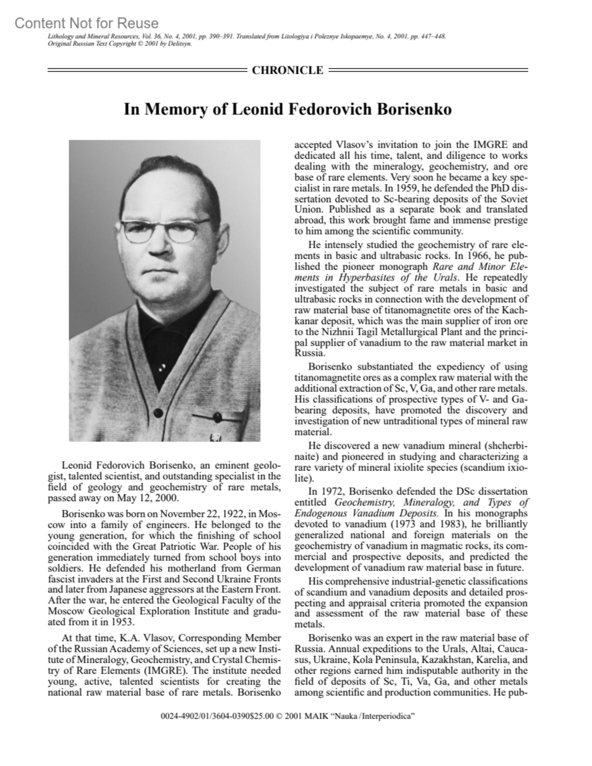 In Memory of Leonid Fedorovich BorisenkoDelitsyn, L. M.Lithology & Mineral Resources 36(4):p 390-391, July-August 2001.Copyright ©2001 Kluwer Academic Publishers