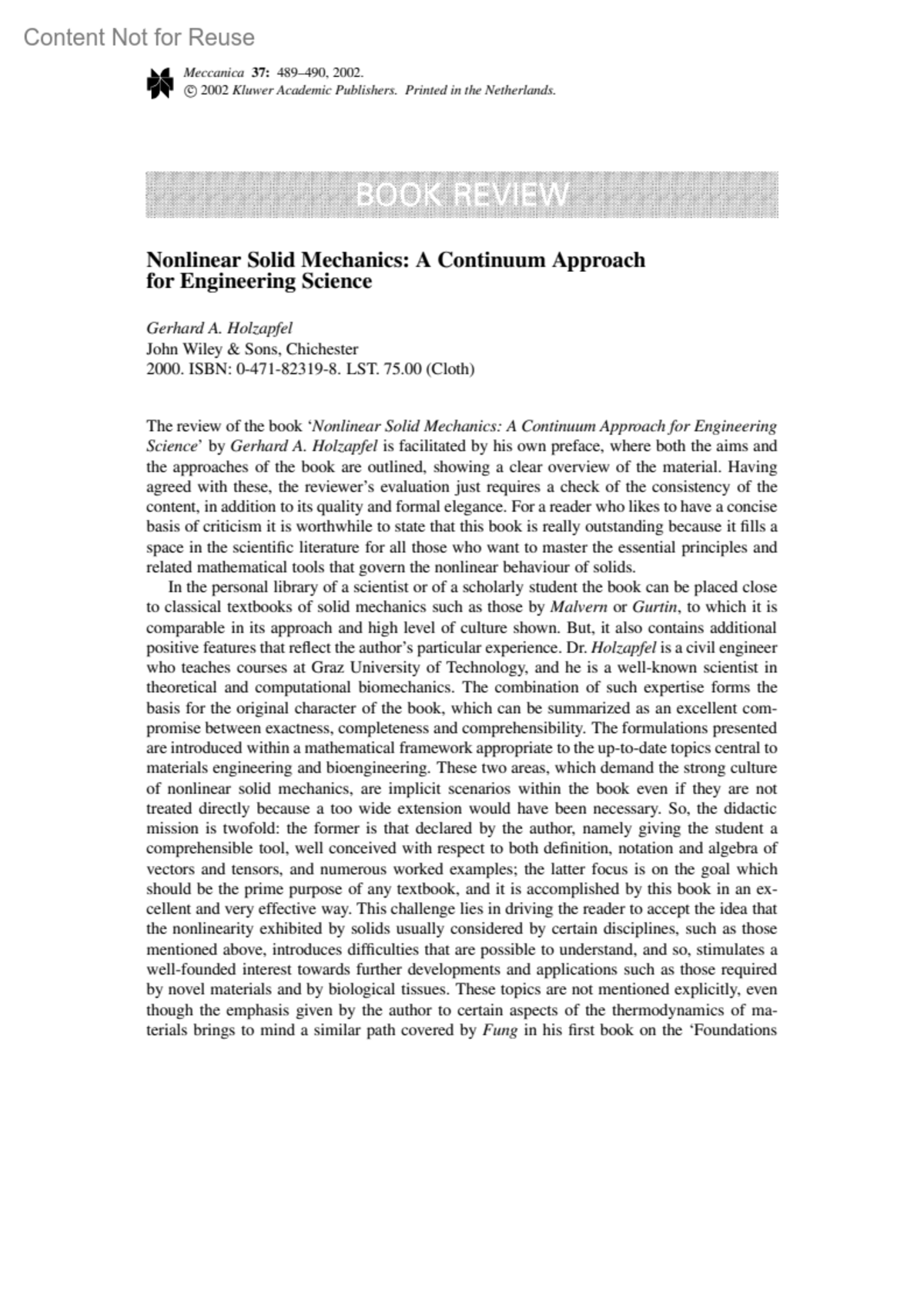 Nonlinear Solid MechanicsA Continuum Approach for Engineering ScienceContro, RobertoMeccanica 37(5):p 489-490, 2002.Copyright ©2002 Kluwer Academic Publishers