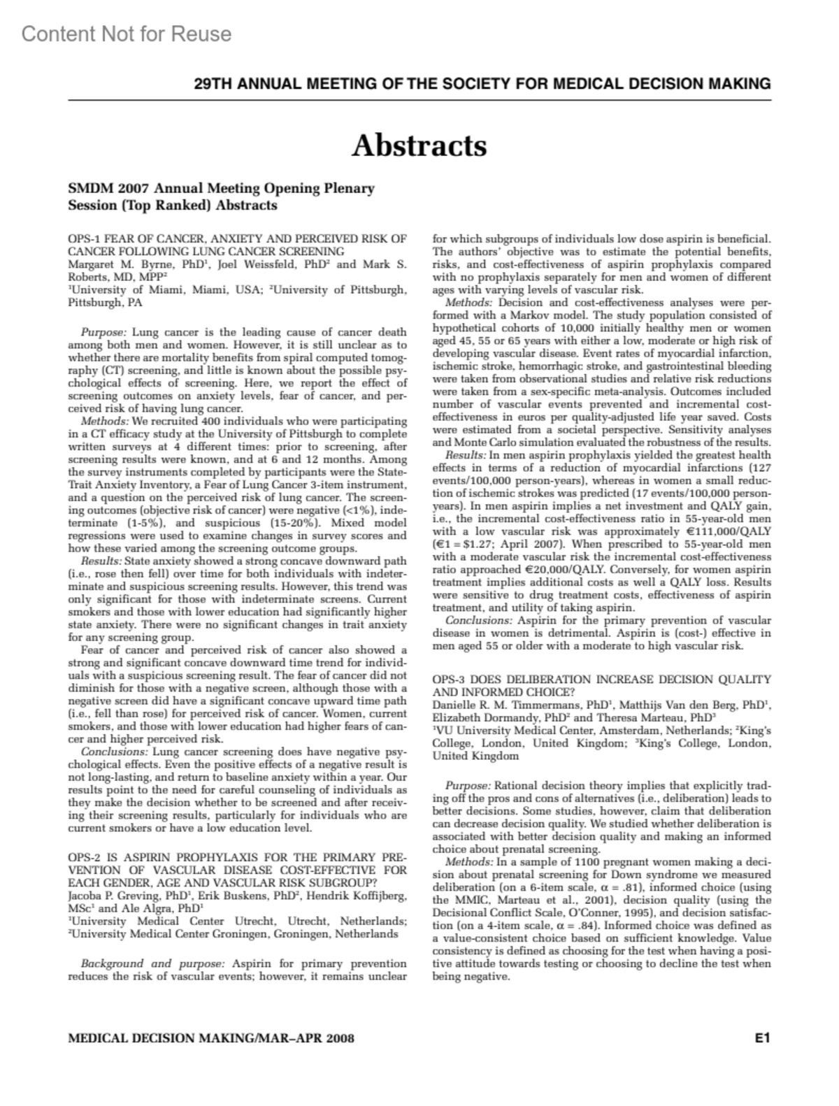 29TH ANNUAL MEETING OF THE SOCIETY FOR MEDICAL DECISION MAKINGMedical Decision Making 28(1):p E1-E97, January 2008. | DOI: 10.1177/0272989X080280010103Copyright ©2008Sage Publications