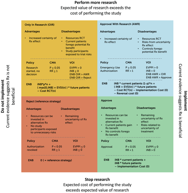 Decision matrix. This 2 × 2 figure shows the 4 potential combined research-treatment strategies, their advantages and disadvantages, the decision rule when this strategy would be selected as the optimal strategy, and how the expected net monetary benefit (ENB) would be calculated for the value-of-information (VOI) analyses to determine the optimal strategy according to the VOI. Difference retrospective/prospective VOI: the number of patients is based on the projections on the date of evaluation (prospective) or on the last data set on the timeline (retrospective). iNB, incremental net (monetary) benefit (NB treat – NB control); p, proportion of patients n in a new randomized controlled trial (RCT) randomly assigned to treatment; 1 − p, proportion of patients n in a new RCT randomly assigned to control; EVSI, expected value of sample information, calculated in comparison with the optimal treatment (i.e., over and above the iNB gained if iNB > 0); EVSI(n), EVSI dependent on sample size n of the new RCT; cost RCT(n), fixed cost + variable cost of performing a new RCT dependent on sample size n. The optimal sample size is determined by maximizing the function in the quadrant with respect to n. Implementation and reversal costs are assumed to be 0 given that the intervention concerns a guideline change.