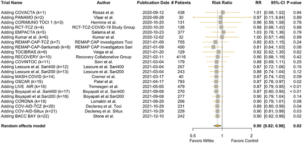 The effect estimate for mortality was expressed as the relative risk (RR) of dying in the intervention arm compared with the control arm. We assume that, despite the diverse biological pathways targeted by MAbs, their mechanism of action is homogenous enough for meaningful meta-analysis. We performed a CMA of all included articles using a random-effects model. We used the Mantel-Haenszel method for pooling and quantifying expected heterogeneity with an I statistic. Between-study variance was quantified using the tau statistic, and its uncertainty was adjusted using the Knapp-Hartung adjustment.